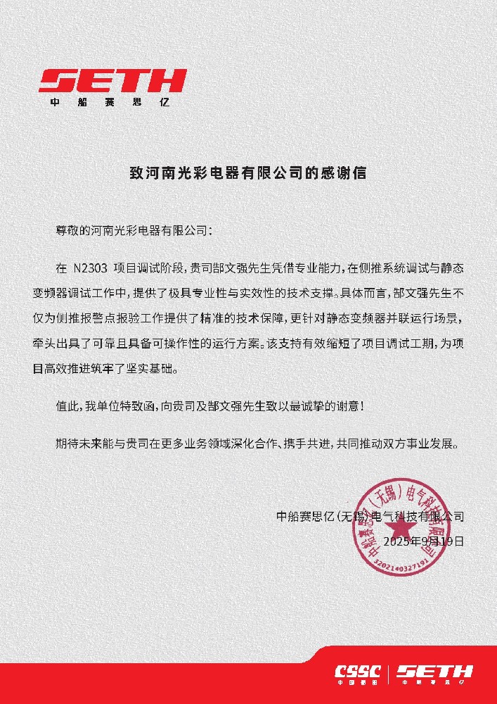 2025.09.22 河南光彩电器获多方感谢 助力欧洲电力推进船项目顺利推进 近日,河南光彩电器有限公司(China GCE)因在N2303电力推进船项目中的突出贡献,先后收到中船赛思亿(无锡)电气科技有限公司与青岛海纳电气自动化系统有限公司的感谢信。两家公司均高度评价China GCE在项目调试中的专业支持与高效服务。N2303项目是中船赛思亿分包给GCE公司实施的重要工程,船东来自德国,船舶主要航行于欧